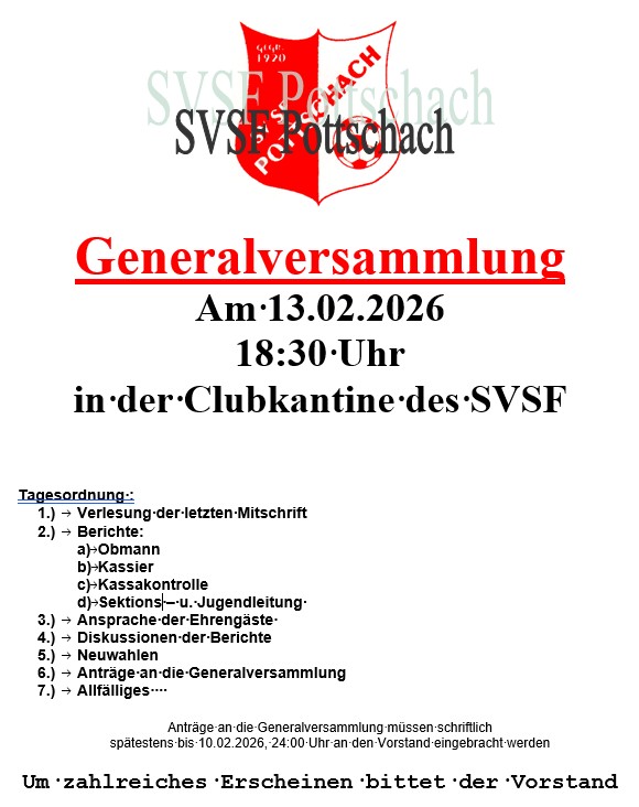 Am Freitag 13.02.2026 lädt der SVSF Pottschach in der Kantine des Pottschacher Sportplatzes zur diesjährigen Generalversammlung. Beginn ist um 18:30 Uhr!