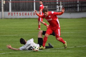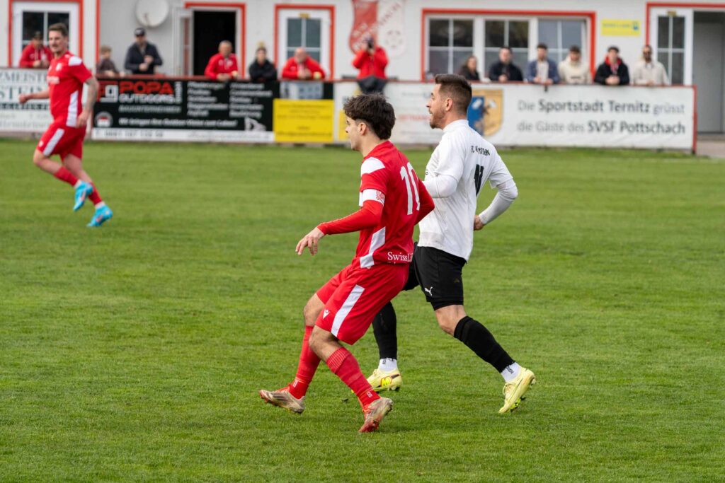 Kurz vor dem Seitenwechsel gab es im Pottschacher Strafraum Elfmeteralarm (43.), Schiedsrichter Hammerer ließ aber wie in Minute 18 auf der anderen Seite, weiterlaufen. Dennoch sollten die Mönicher in der ersten Halbzeit zu einem Treffer kommen. Nach einem weiten Pass versenkte Balagovic via Innenstange zum zwischenzeitlichen 5:1 (45.+2). Aber praktisch im Gegenzug stellte der SVSF den Fünf-Tore Vorsprung wieder her. Nach einem gut getretenen Simon-Eckball bugsierte sich der Mönicher Sinnreich den Ball ins eigene Tor – 6:1 (45.+4).