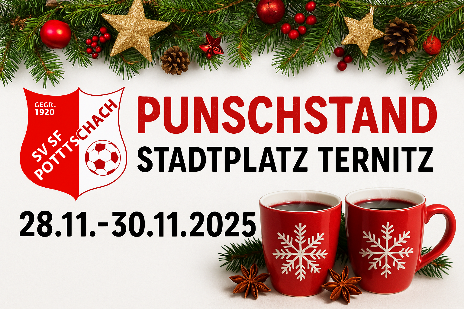 An den zwei kommenden Wochenenden findet am Ternitzer Stadtplatz jeweils ab 15:00 Uhr der alljährliche Adventmarkt der Stadtgemeinde Ternitz statt! Mit von der Partie am ersten Wochenende ist wie immer auch der SVSF Pottschach mit seinem Punschstand, der die Besucher mit leckeren Heißgetränken und kleine Snacks versorgen wird!