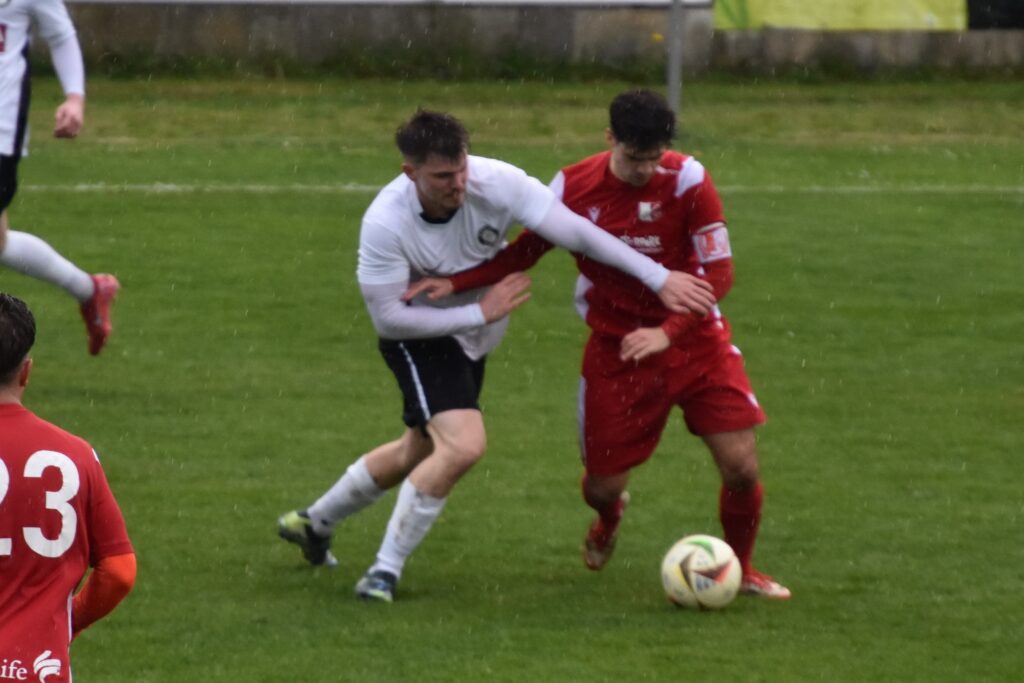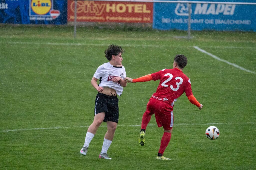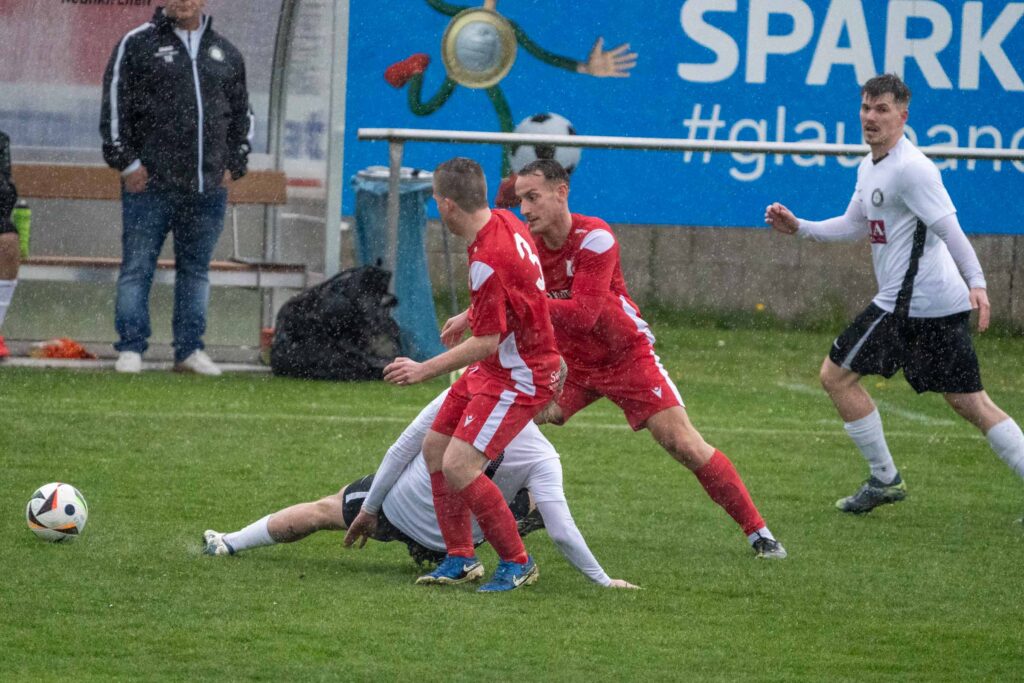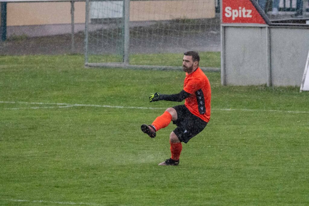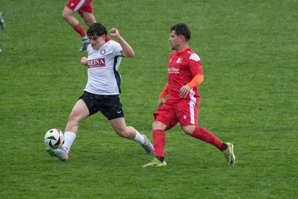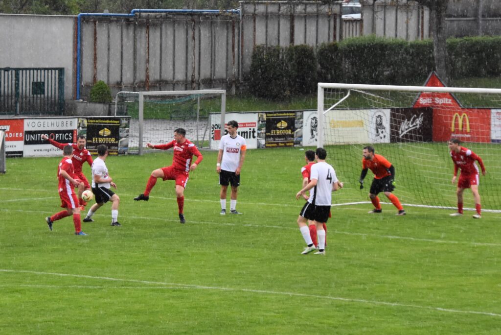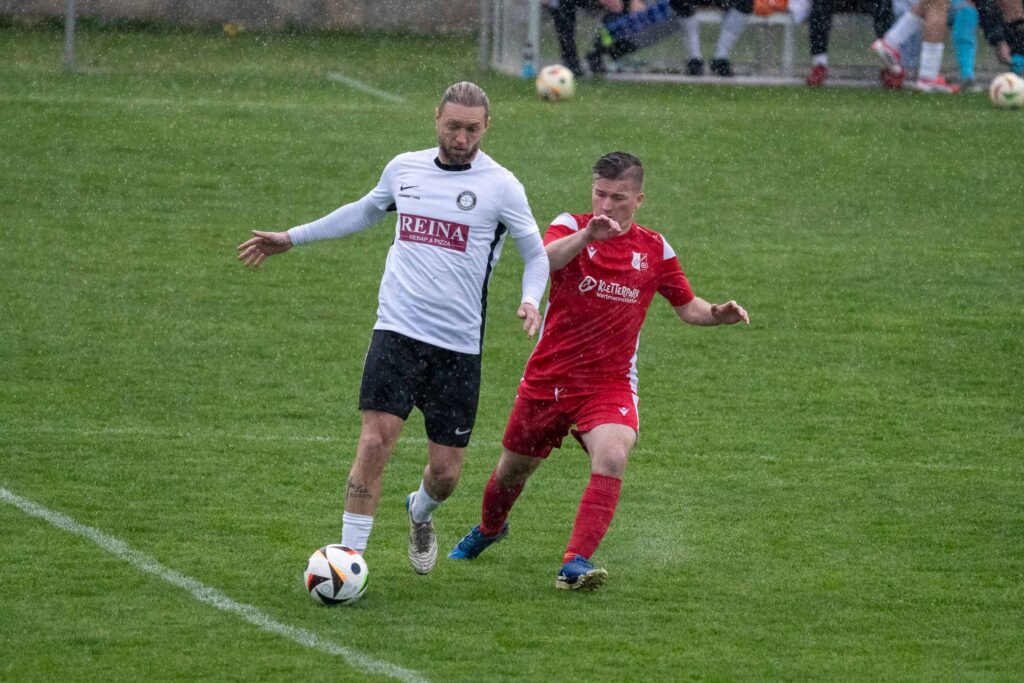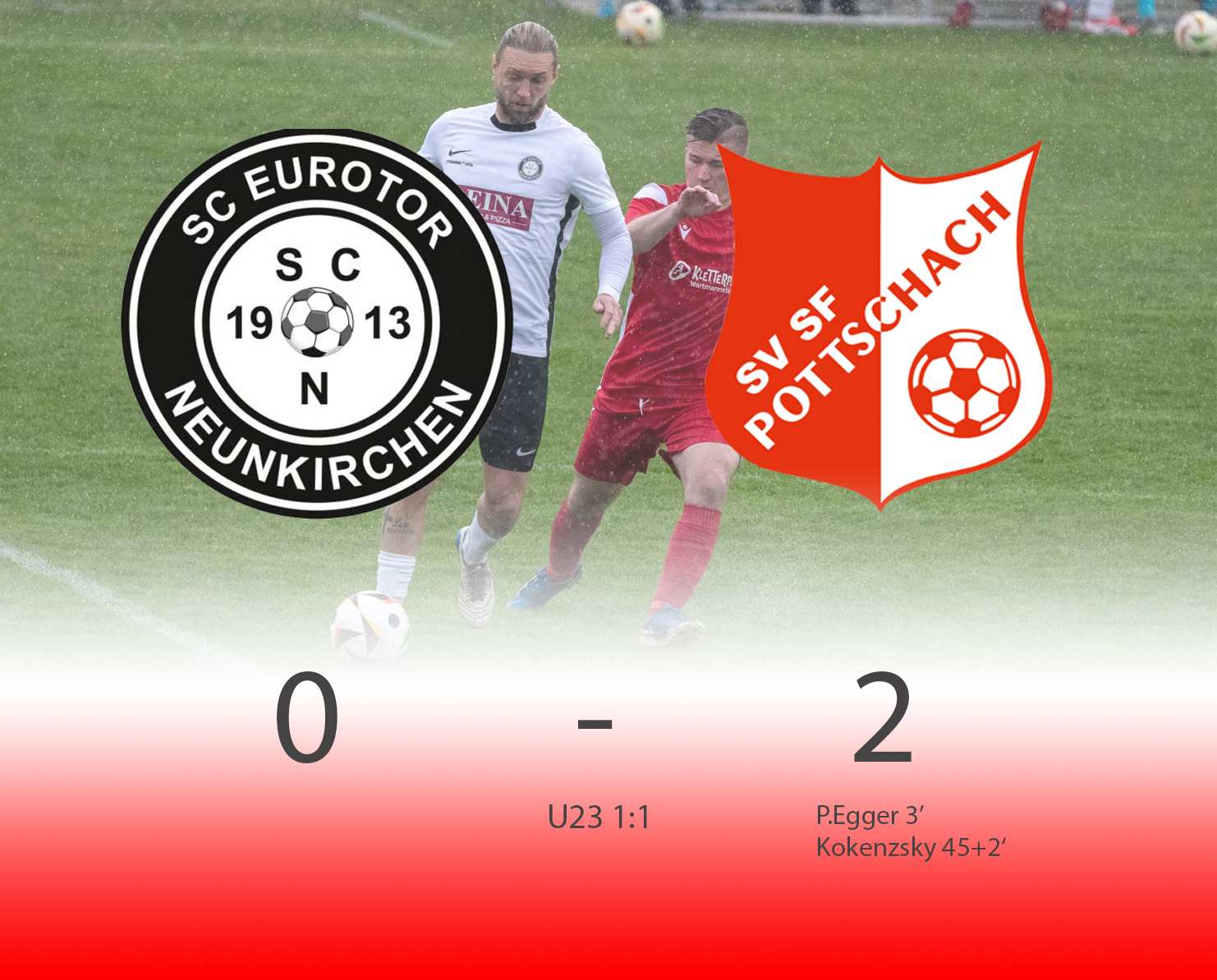 Vor ansprechender Kulisse startete der SVSF Pottschach perfekt in die Partie. Denn bereits nach nicht einmal drei Minuten konnten die zahlreich mitgereisten SVSF-Fans auf der neuen Tribüne der Neunkirchner Sportanlage die Hände zum ersten Mal an diesen Tag in die Höhe reißen! Nach einem perfekten Zuspiel von Mark Simon in den Lauf von Philipp Egger besorgte der SVSF-Kapitän mit dem ersten Abschluss einen Auftakt nach Maß – 0:1 (3.). Neunkirchen benötigte rund zehn Minuten, um besser in die Partie zu kommen. Die Gastgeber hatte nach rund einer viertel Stunde etwas mehr Ballbesitzphasen als der SVSF, konnten aber bis auf wenige Ausnahmen nicht gefährlich in die Nähe des Pottschacher Strafraums kommen. Die einzig erwähnenswerte Chance in Durchgang eins hatten die Bezirkshauptstädter in Minute 18., als nach einem Eckball Mathias Liebezeit den Ball auf der Linie klärte. Hier wäre SVSF-Schlussmann Christoph Hackl ohne Abwehrmöglichkeit gewesen. Ansonsten war es bei strömenden Regen eine eher umkämpfte Partie zwischen den Strafräumen, bei der die weiten Pässe das häufigste angewendete Mittel war. So dauerte es, von einem gefährlichen Freistoßaufsitzer von Mark Simon den Neunkirchen Schlussmann Kobas zur Ecke klären konnte (24.), bis kurz vor dem Seitenwechsel, um noch zwei Top-Möglichkeiten zu verzeichnen! Zuerst tauchte Philipp Egger nach einem Solo plötzlich allein vor Neunkirchen-Schlussmann Kobas auf, sein Schuss jedoch zu schwach und unplatziert. Leider übersah Egger den in der Mitte völlig blank stehend und einschussbereiten Kokenzsky (45.). Aber der Torjubel sollte nur wenige Augenblicke später nachfolgen! In der zweiten Minute der Nachspielzeit bediente Dominic Brandstätter Norbert Kokenzsky mustergültig, der ungarische Legionär musste den Ball zu seinem 17. Saisontreffer nur mehr über die Linie bugsieren – 0:2 (45+2.). Somit ging der SVSF mit einer 2:0 Führung in die Pause!
